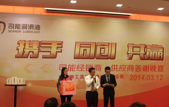 ??????? 2014年3月12日,在江蘇溧陽御水溫泉酒店內,一場盛大的訂貨會正在進行,這是廣西柳工高級潤滑油有限公司舉辦的一場以“攜手 同創 共贏“為主題的大規模訂貨會。當天共計有120余人參與該活動。“司能”憑借其高品質放心油以及強大的公司實力贏得了客戶的認同,當天一舉拿下了近千萬元的訂單。
