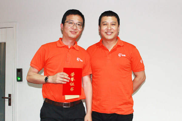 △江蘇司能總經理賈汝濤與獲得大客戶維穩進步冠軍陳遠銘合影。