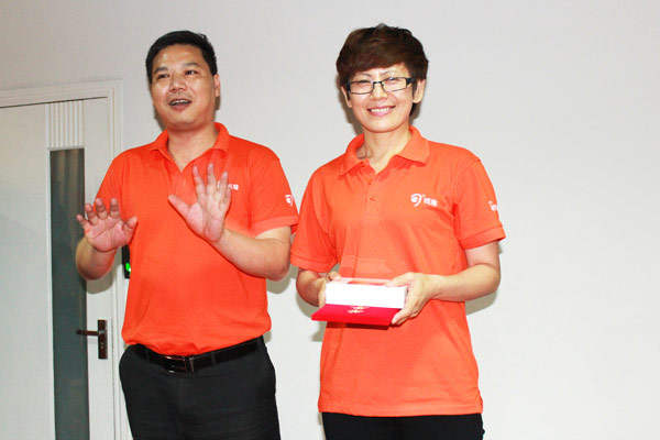 △總經理助理李紹英為大客戶經理張劍鋒頒發最佳進步獎。