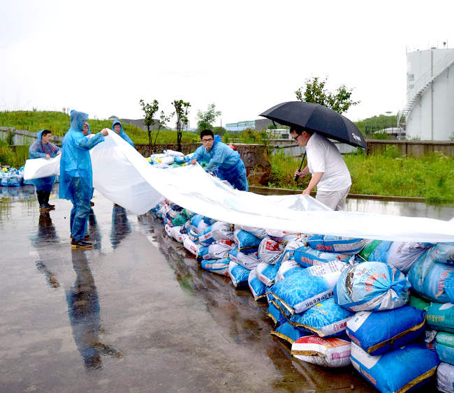 ? ? ? ? 2016年6月28日中午12時左右,溧陽地區連續強降雨使蕪申運河水位由早上8點的4.5米急速上升至5.5米,水面距離公司碼頭駁岸距離不到0.5米。發現這一情況,司能石化常務副總經理吳土金立即組織和號召江蘇司能防汛抗洪小組第一時間緊急啟動一系列防汛抗洪應急措施: